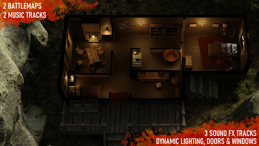 - 3 high resolution Battlemaps: Forest Cabin map with night variant, and Cabin Basement map in 4k resolution, rendered in 3d software for a realistic feel.